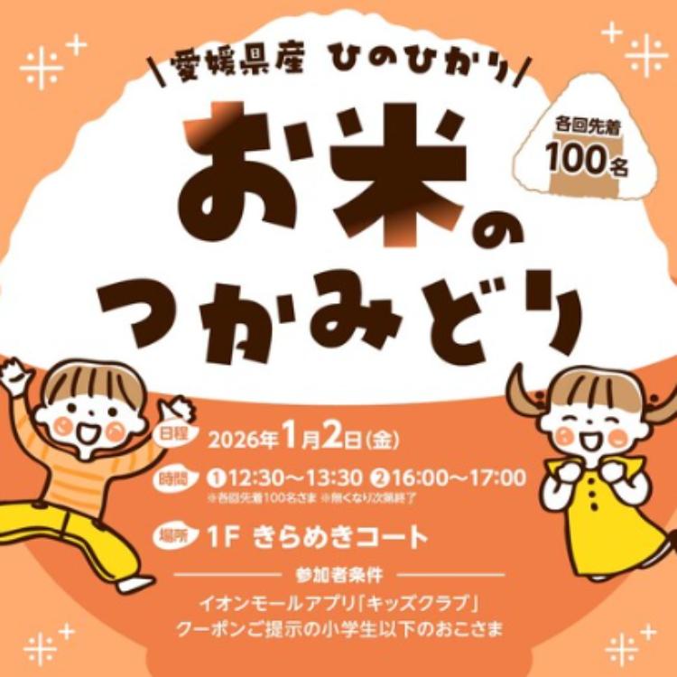 愛媛県今治市の「イオンモール今治新都市 1F きらめきコート」で、2026年1月2日(金)に、 「キッズ お米のつかみどり チャレンジ!」が開催されます。