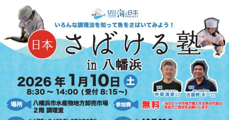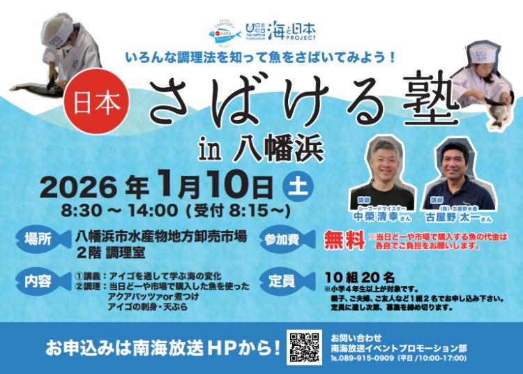 愛媛県八幡浜市の「八幡浜市水産物地方卸売市場 2階 調理室」で、2026年1月10日(土)に、「海と日本プロジェクト 日本さばける塾in八幡浜」が開催されます。