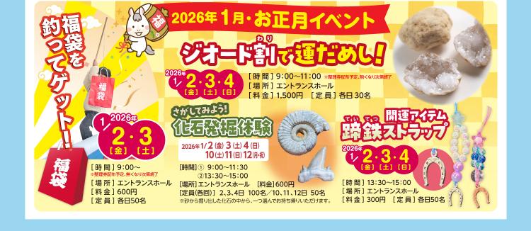 福袋を釣ってゲット!、ジオード割で運だめし!、化石発掘体験など、お正月限定のイベントが多数開催!!