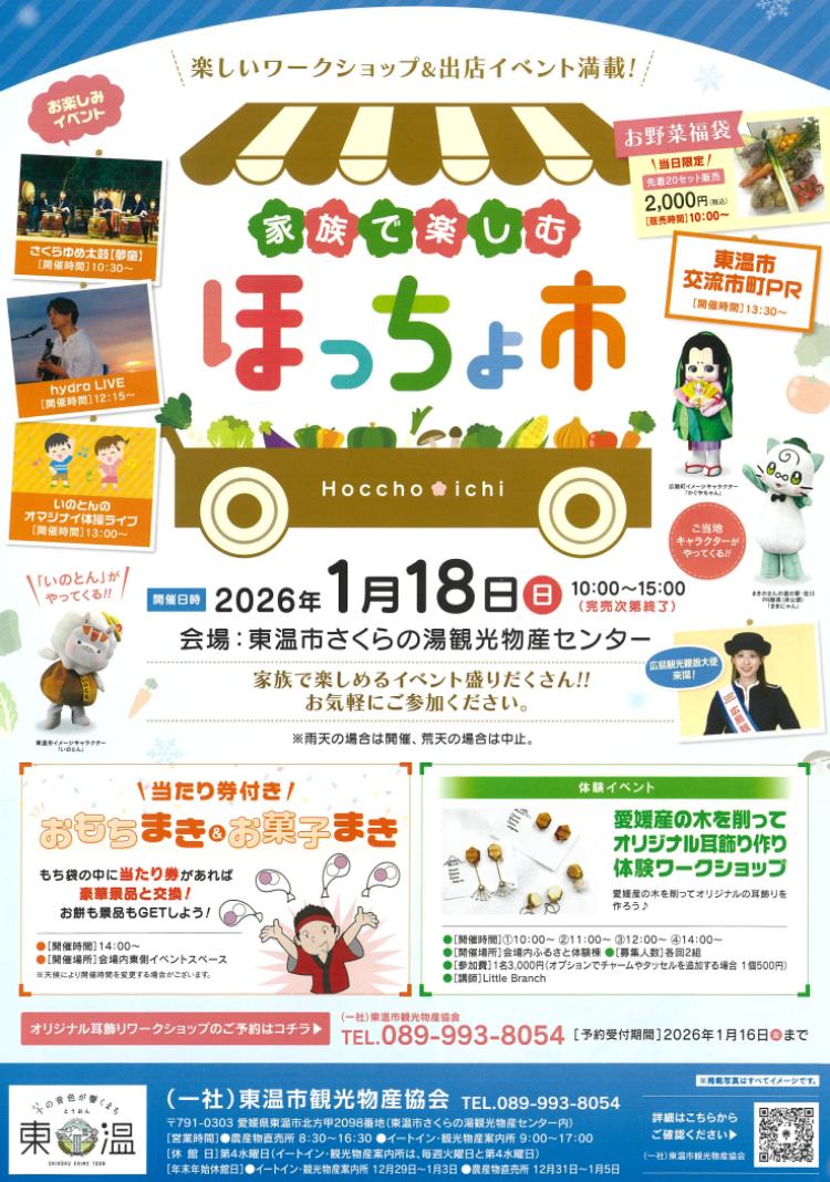 愛媛県東温市の「東温市さくらの湯観光物産センター」で、2026年1月18日(日)に、 「家族で楽しむほっちょ市」が開催されます。
