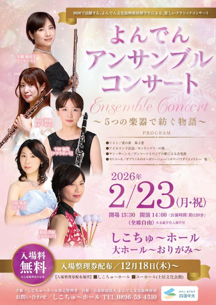 愛媛県四国中央市の「しこちゅ~ホール」(四国中央市市民文化ホール)で、2026年2月23日(月・祝)に、「よんでんアンサンブルコンサート ~5つの楽器で紡ぐ物語~」が開催されます。