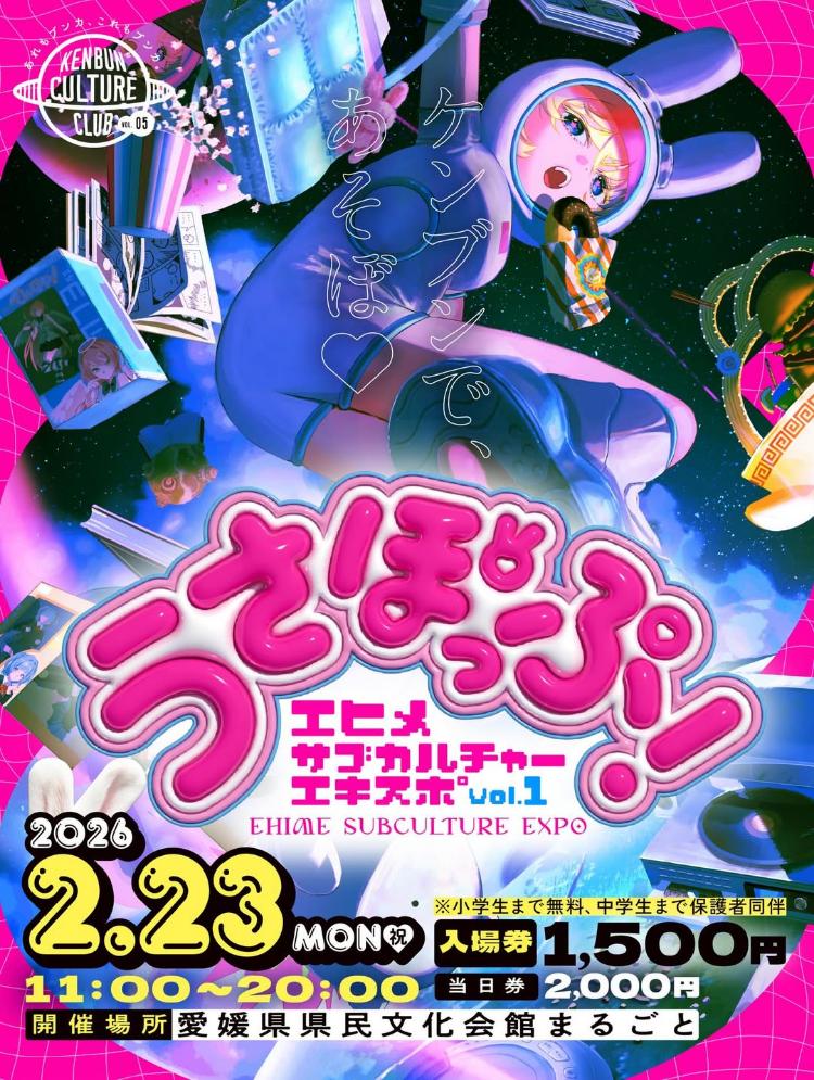 愛媛県松山市の「愛媛県県民文化会館」で、2026年2月23日(月・祝)に、「うさぽっぷ エヒメサブカルチャーエキスポ vol.1」が開催されます。