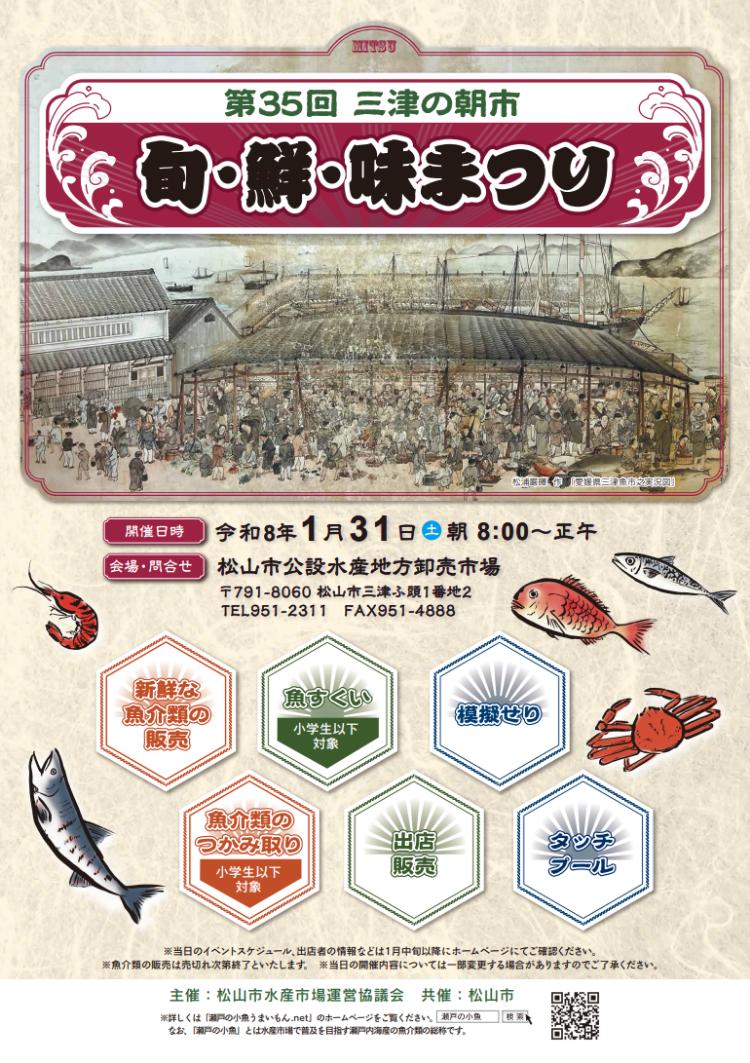 愛媛県松山市の「松山市公設水産地方卸売市場」で、2026年1月31日(土)に、第35回三津の朝市「旬・鮮・味まつり」が開催されます。