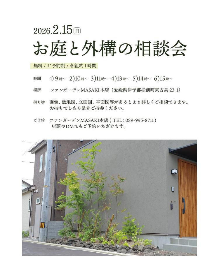 愛媛県伊予郡松前町の「ファンガーデンMASAKI本店」で、2026年2月15日(日)に、「お庭と外構の相談会」が開催されます。