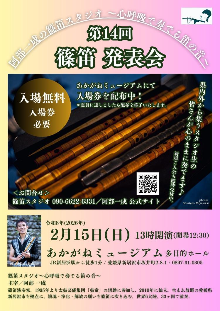 愛媛県新居浜市の「あかがねミュージアム 多目的ホール」で、2026年2月15日(日)に、「阿部一成の篠笛スタジオ〜心呼吸で奏でる笛の音〜第14回 篠笛発表会」が開催されます。