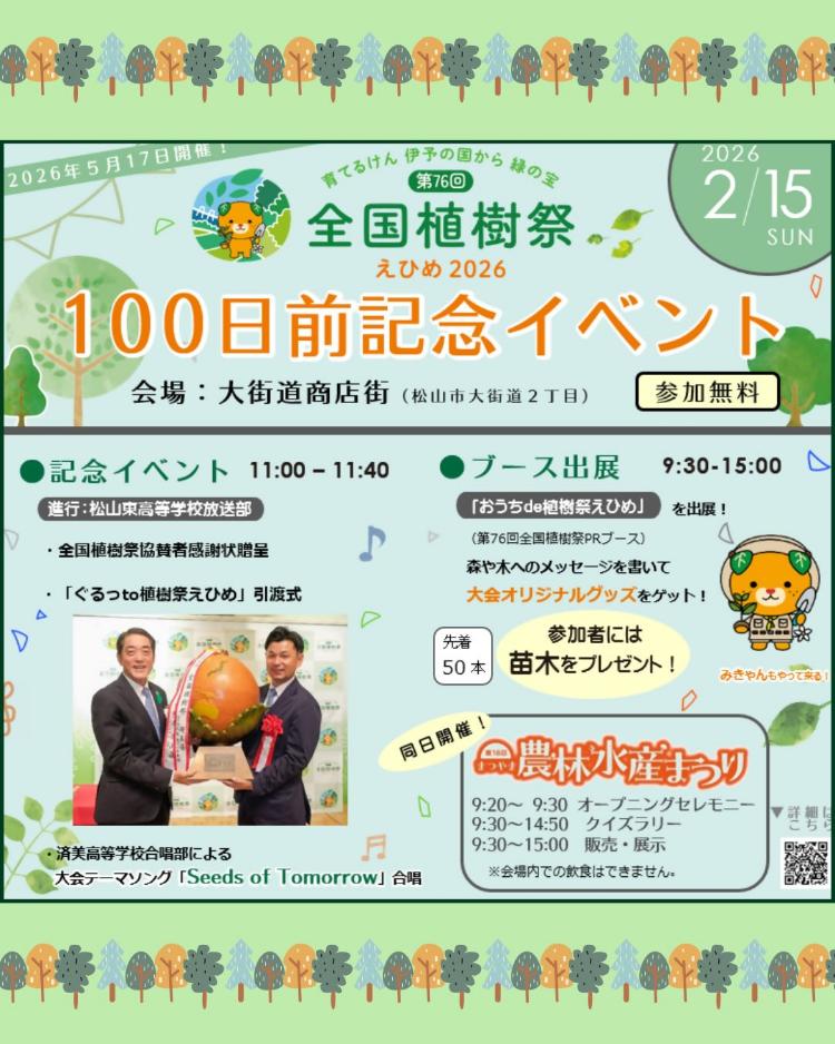 全国植樹祭えひめ2026の開催まであと100日!ぜひ参加して、みんなで植樹祭を盛り上げましょう♪