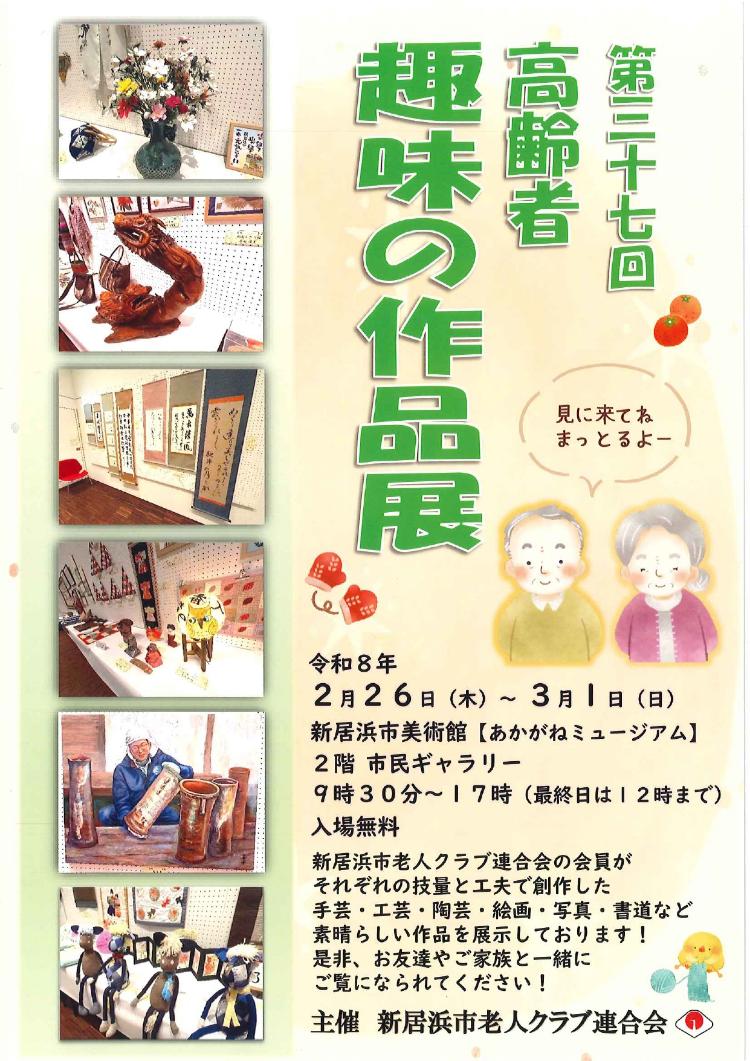愛媛県新居浜市の「あかがねミュージアム 2階 市民ギャラリー」で、2026年2月26日(木)~3月1日(日)の期間、「第37回 高齢者趣味の作品展」が開催されます。