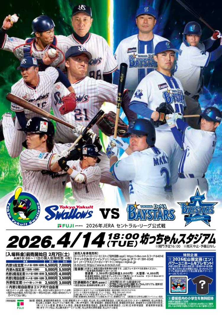愛媛県松山市の「松山中央公園野球場」(坊っちゃんスタジアム)で、2026年4月14日(火)に、「2026 JERA セ・リーグ公式戦 東京ヤクルトスワローズ vs 横浜DeNAベイスターズ」の開催が決定!