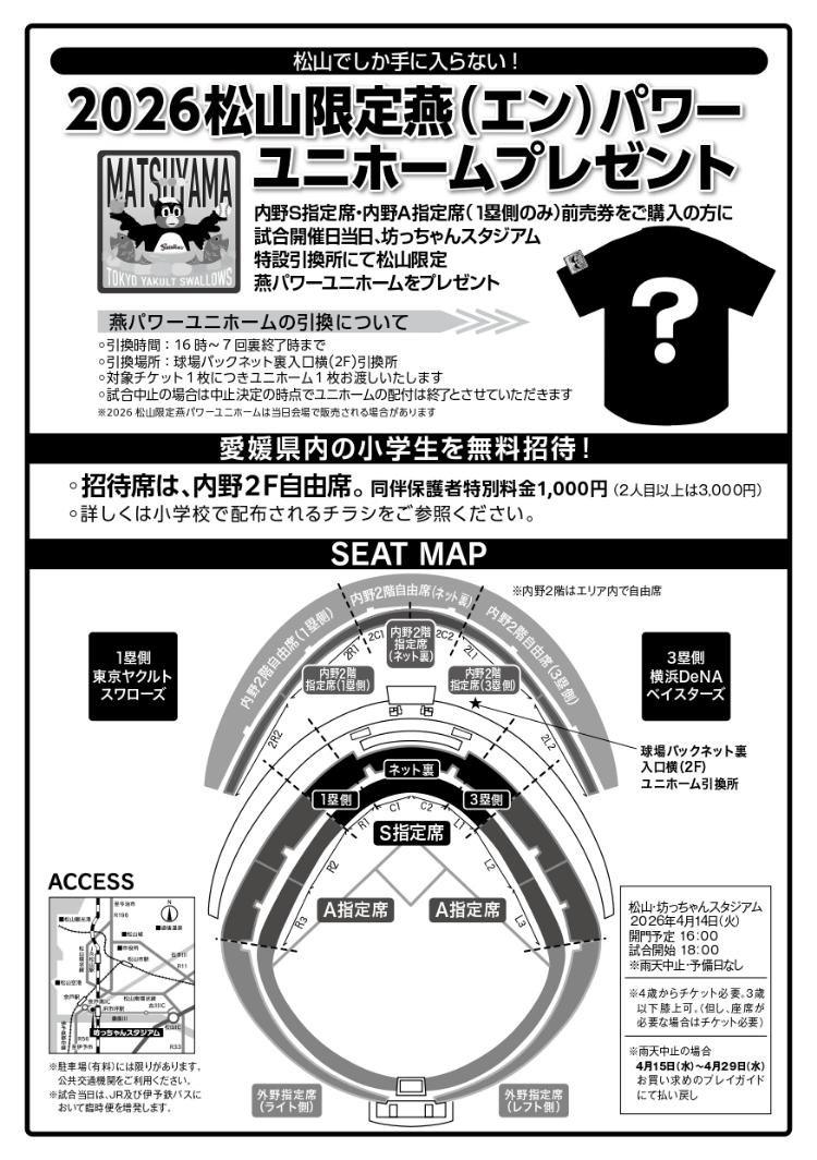 内野S指定席・内野A指定席(1塁側のみ)前売券をご購入の方には、2026松山限定燕(エン)パワーユニフォームをプレゼント!