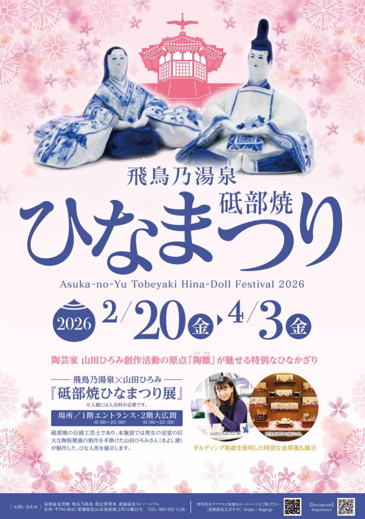 愛媛県松山市の「道後温泉別館 飛鳥乃湯泉」で、2026年2月20日(金)~4月3日(金)の期間、「砥部焼ひなまつり展2026」が開催されています。
