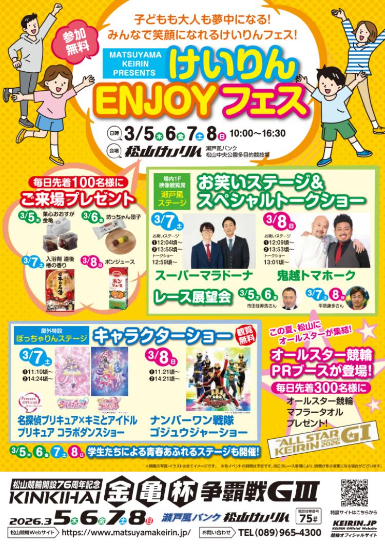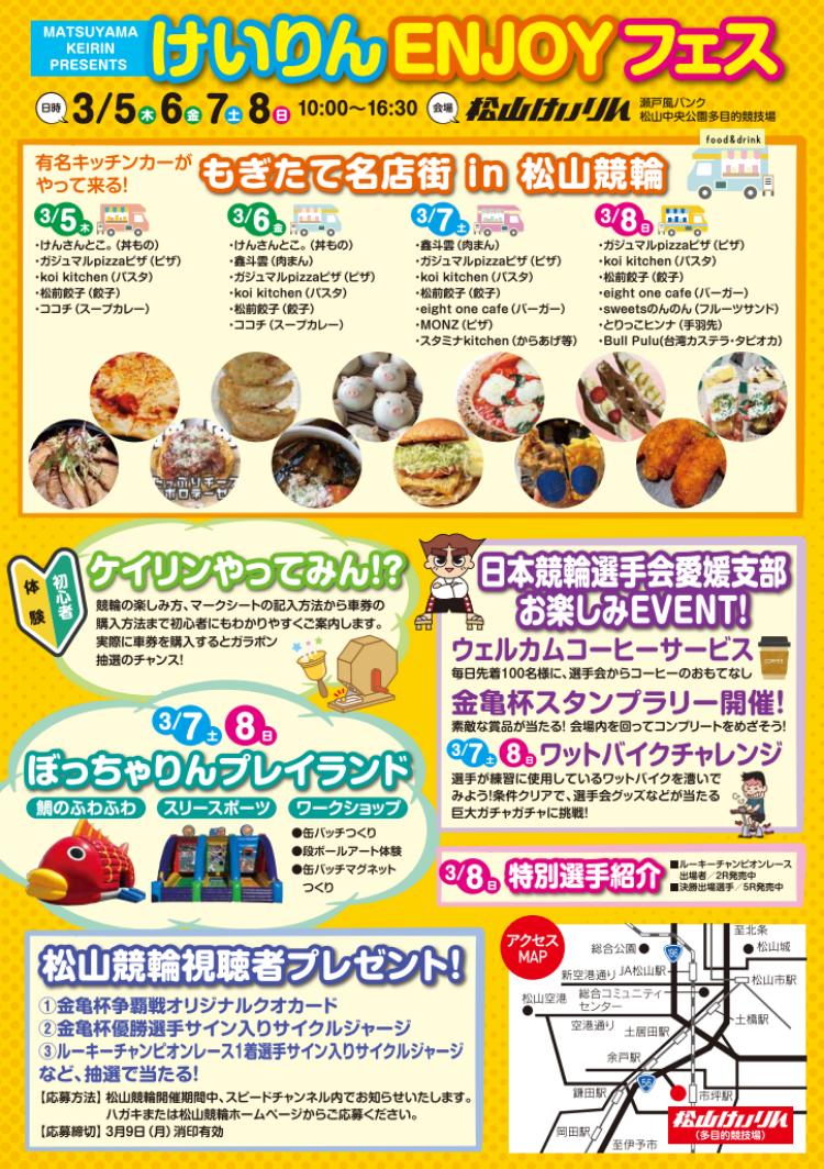 愛媛県松山市の「松山けいりん」で、2026年3月5日(木)~8日(日)の4日間、「けいりんENJOYフェス」が開催されます。