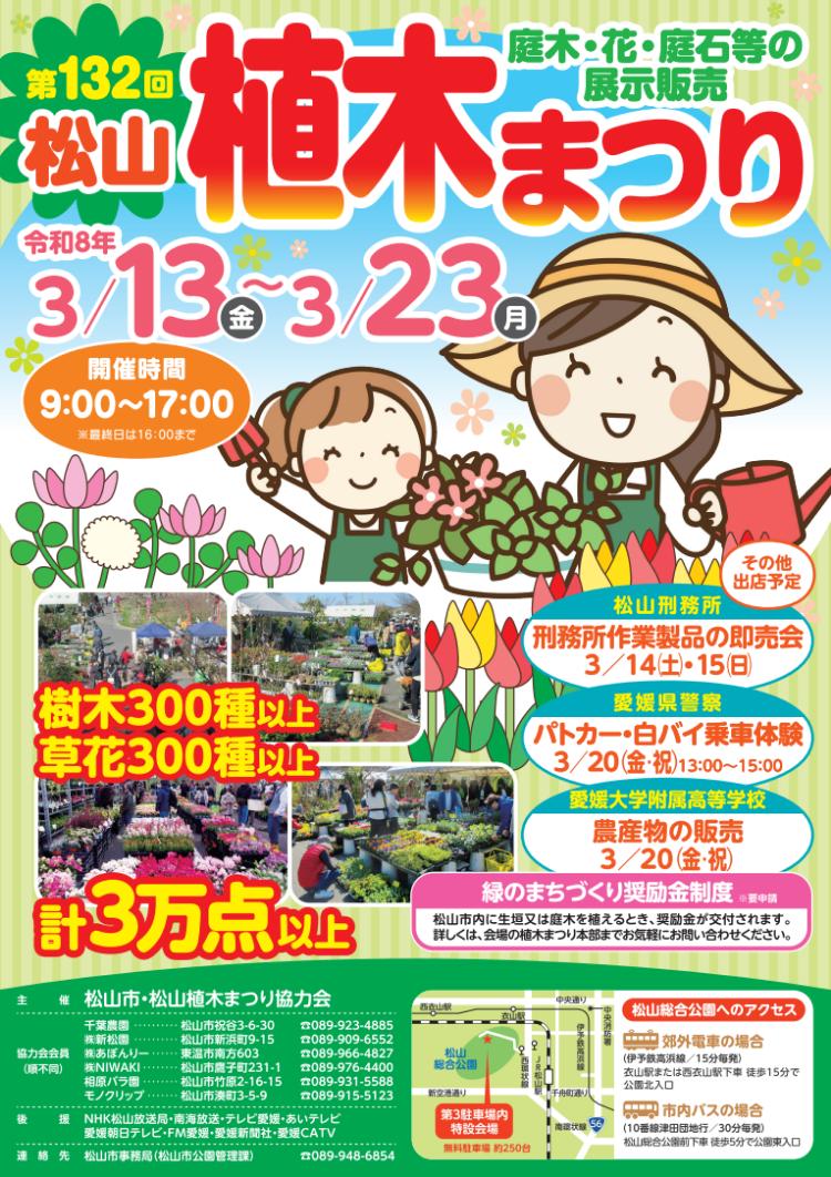 愛媛県松山市朝日ヶ丘の「松山総合公園 第3駐車場」で、2026年3月13日(金)~23日(月)の期間、「第132回 松山植木まつり」が開催されます。