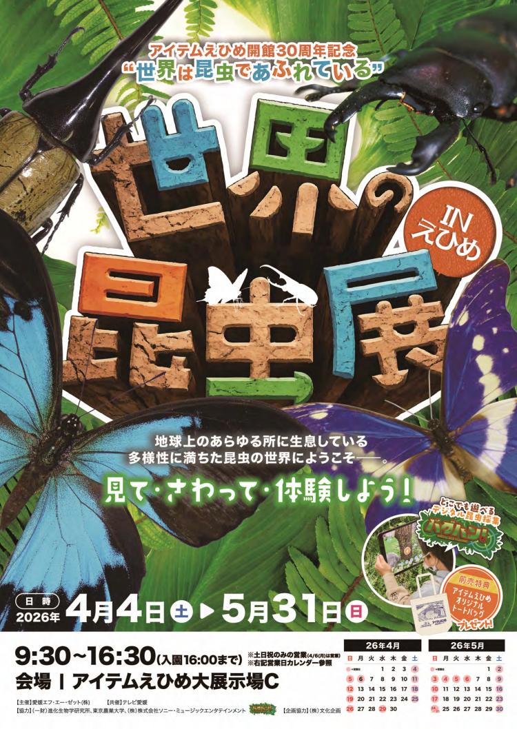 愛媛県松山市の「アイテムえひめ 大展示場C」で、2026年4月4日(土)~5月31日(日)の期間(土日祝のみ・平日は4月6日のみ)、「世界の昆虫展 IN えひめ」が開催されます。