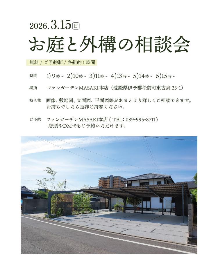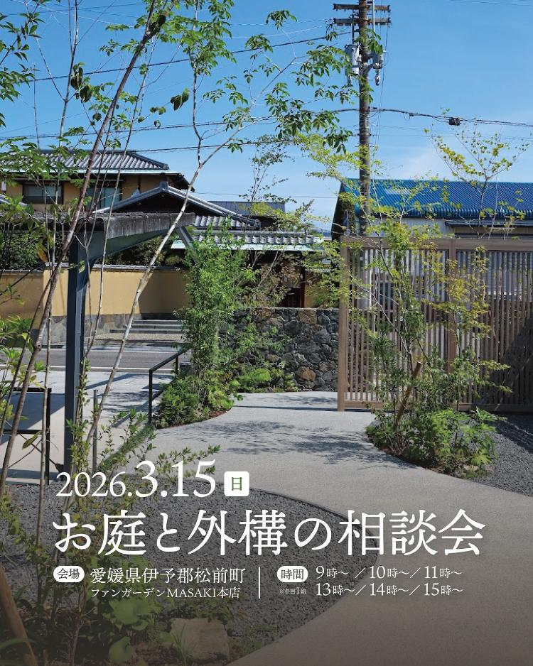 愛媛県伊予郡松前町の「ファンガーデンMASAKI本店」で、2026年3月15日(日)に、「お庭と外構の相談会」が開催されます。