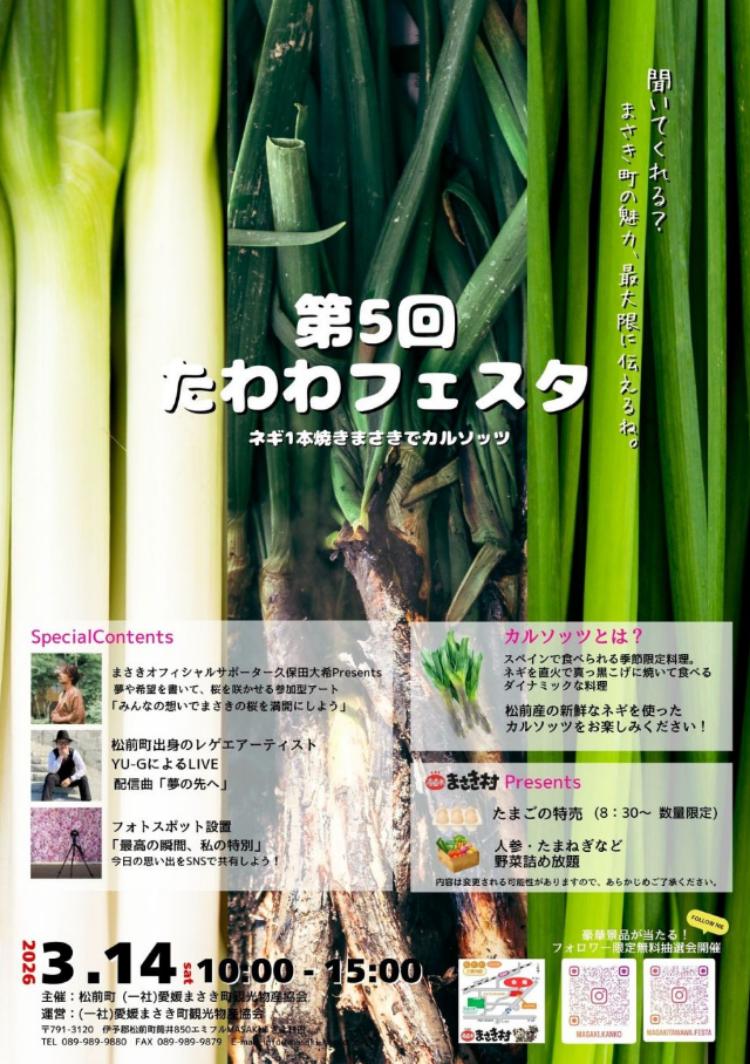 愛媛県伊予郡松前町の「まさき村前駐車場」(エミフルMASAKI)で、2026年3月14日(土)に、「第5回 たわわフェスタ-ねぎ一本焼き まさきでカルソッツ-」が開催されます。