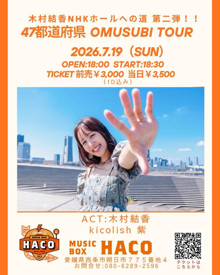 愛媛県西条市の「Music Box HACO」で、2026年7月19日(日)に、「木村結香 47都道府県 OMUSUBI TOUR」が開催されます。