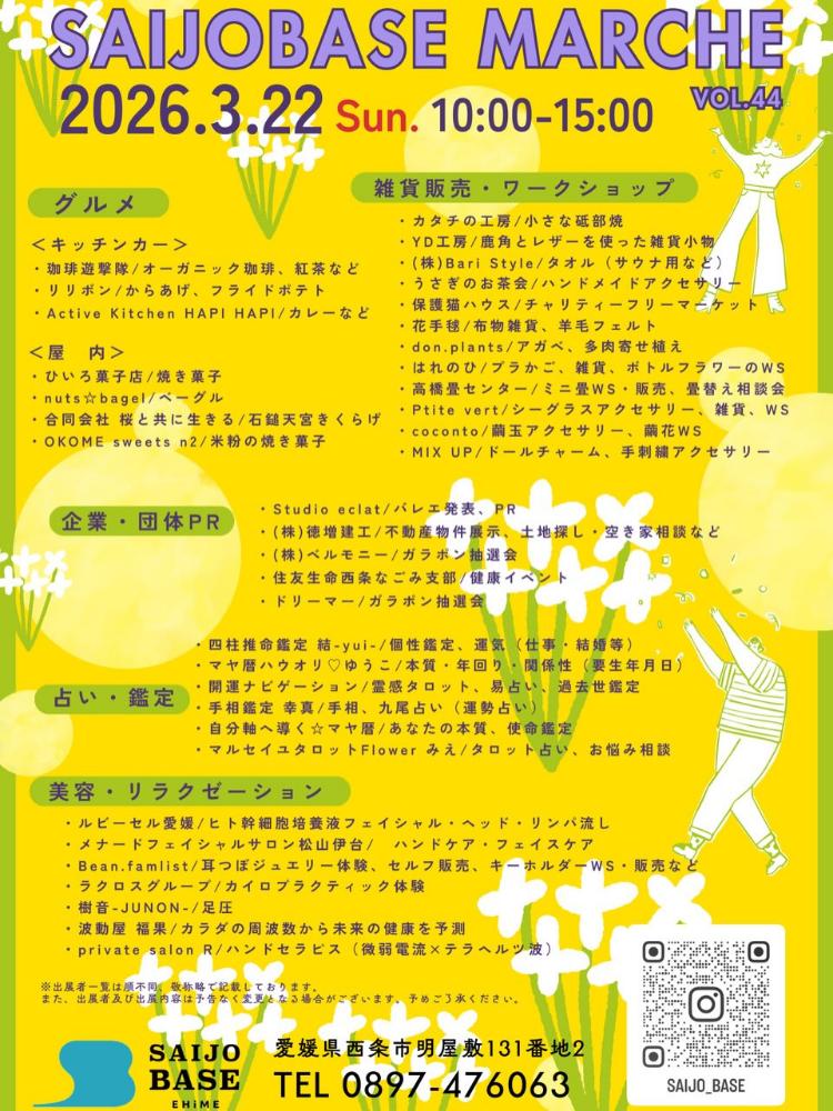 愛媛県西条市の「SAIJO BASE」(西条ベース)で、2026年3月22日(日)に、『SAIJO BASEの日』が開催されます。