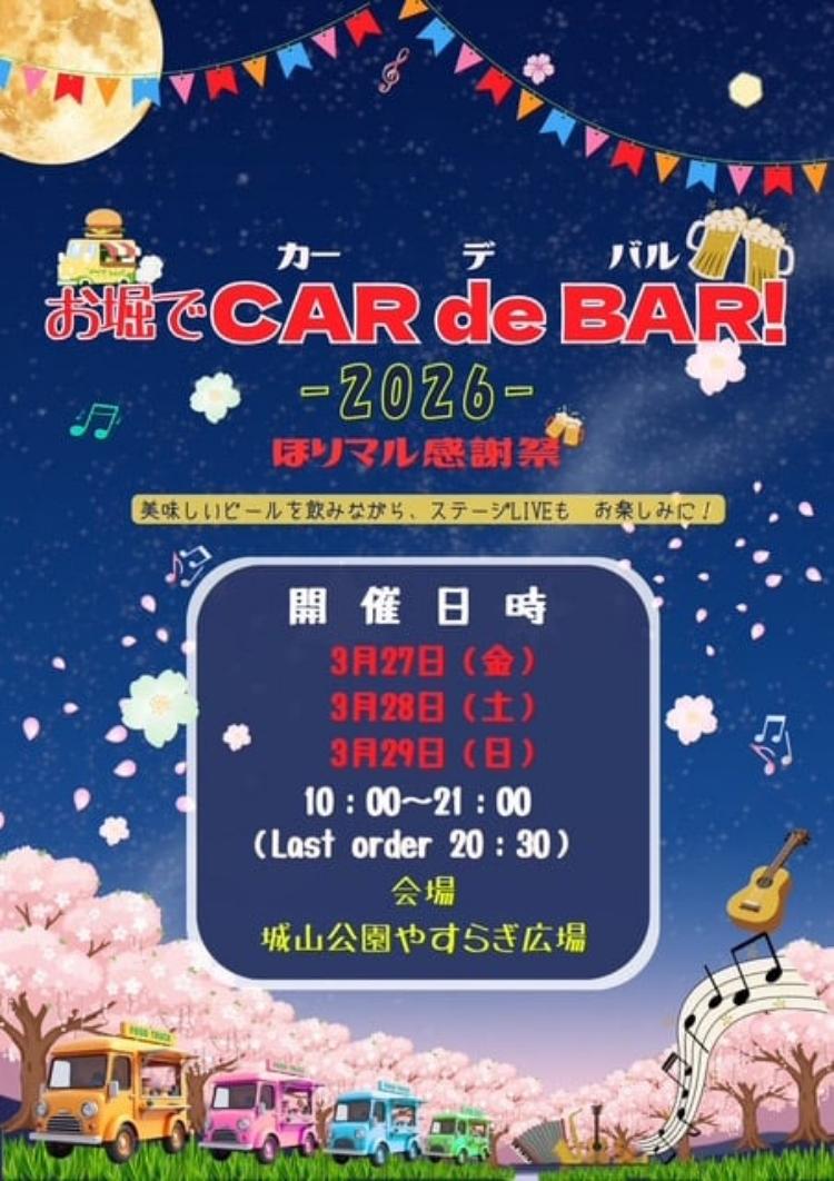 愛媛県松山市の「城山公園 やすらぎ広場」で、2026年3月27日(金)~29日(日)の3日間、「お堀でCAR de BAR~ほりマル感謝祭~」が開催されます。