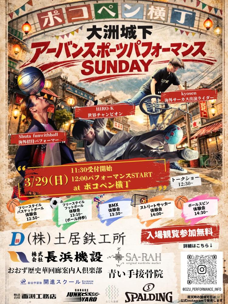 愛媛県大洲市の「ポコペン横丁」で、2026年3月29日(日)に、「大洲城下アーバンスポーツパフォーマンスSUNDAY」が開催されます。