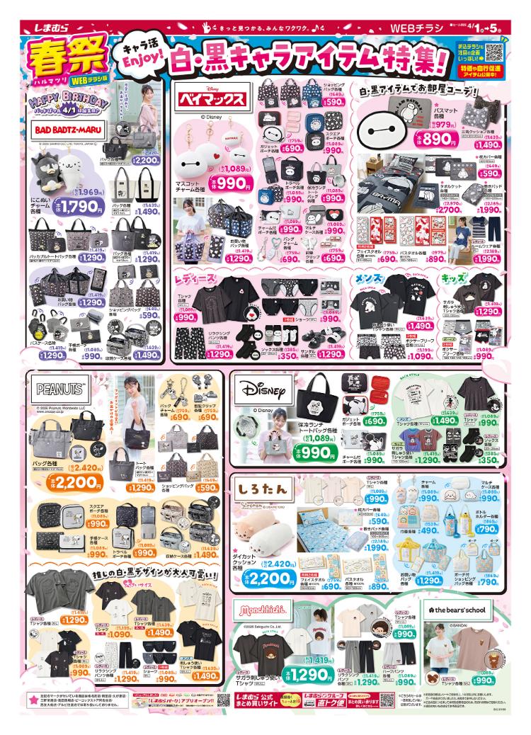 【しまむら】最新チラシ情報(4/1~)キャラ活Enjoy!白・黒キャラアイテム特集!