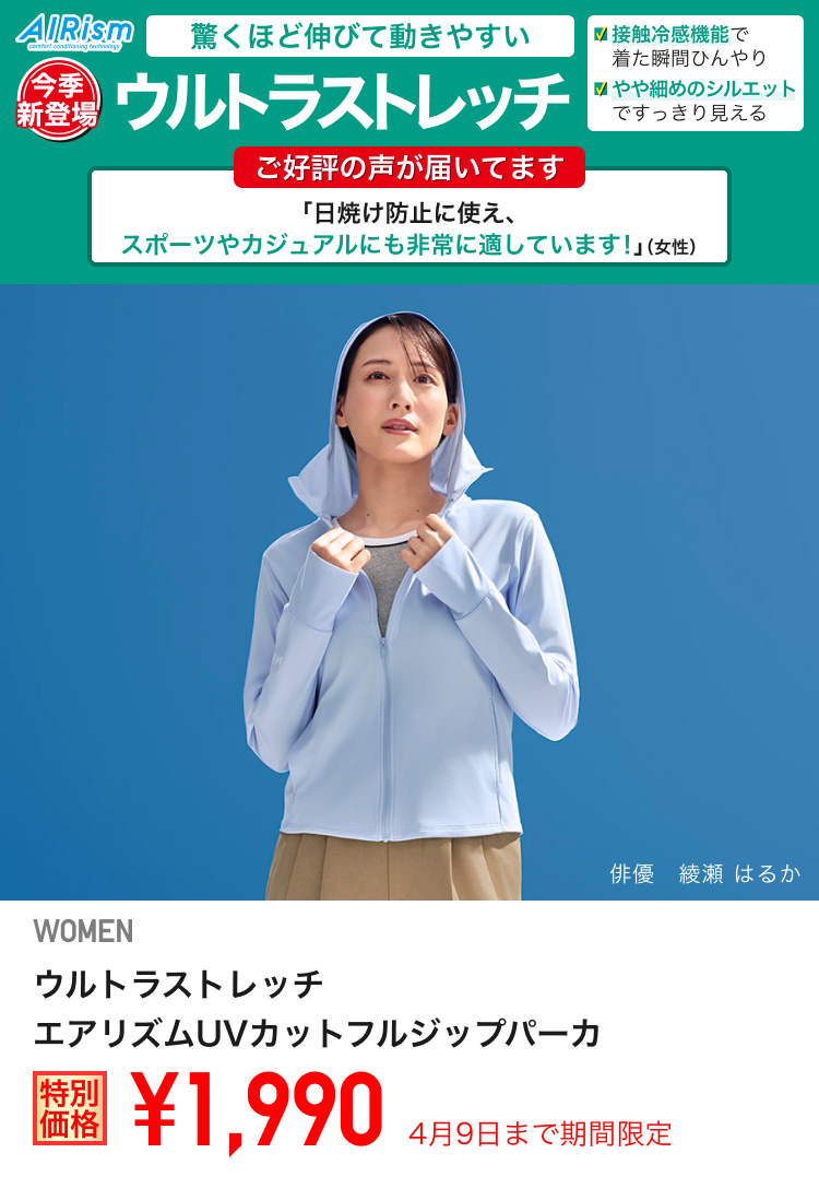 今回は、「ウルトラストレッチエアリズムUVカットフルジップパーカ」や「ドライEXUVカットフルジップパーカ」などが特別価格で登場!