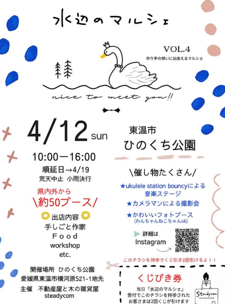 愛媛県東温市の「東温市ひのくち公園」で、2026年4月12日(日)に、 「水辺のマルシェ VOL.4」が開催されます。