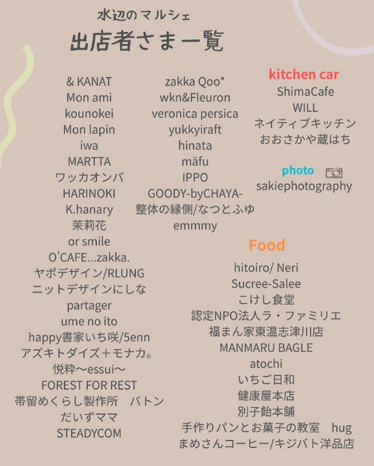 「水辺のマルシェ VOL.4」出店情報は下記のとおりです。