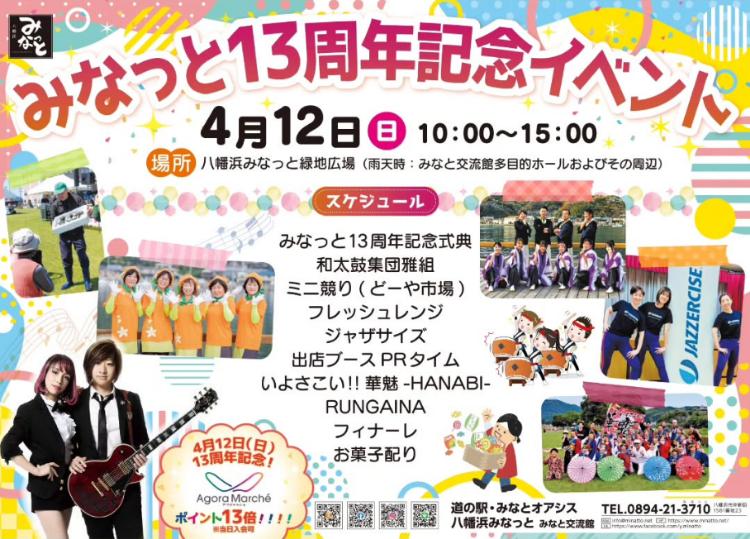道の駅 みなとオアシス八幡浜みなっと13周年を記念したイベントです。和太鼓演奏やよさこいなどイベント盛りだくさん!