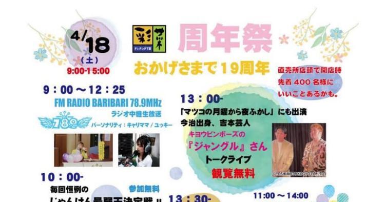 愛媛県今治市の「さいさいきて屋」で、2026年4月18日(土)に、「さいさいきて屋 19周年祭」が開催されます。