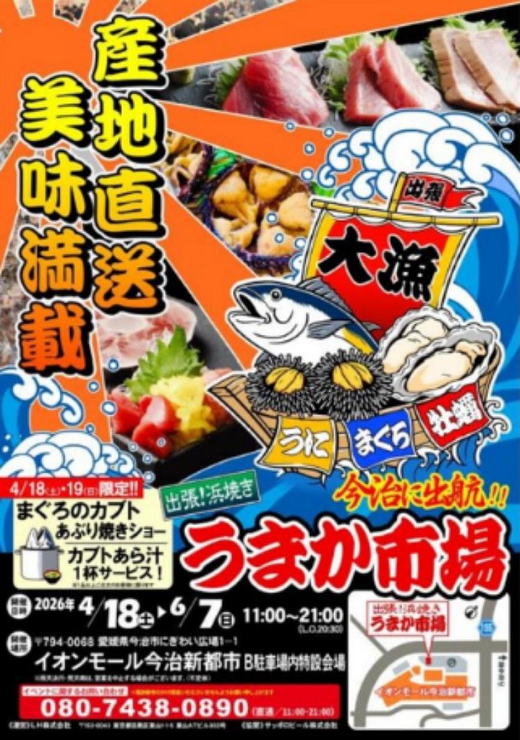 愛媛県今治市の「イオンモール今治新都市 B駐車場」で、2026年4月18日(土)~6月7日(日)の期間、「出張!浜焼き うまか市場」が開催されます。