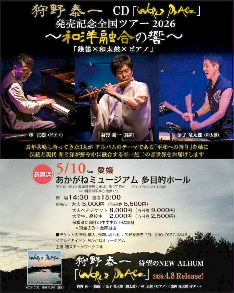 愛媛県新居浜市の「あかがねミュージアム 多目的ホール」で、2026年5月10日(日)に、「篠笛 × 和太鼓 × ピアノ公演 〜和洋融合の響〜 WORLD PEACE」が開催されます。