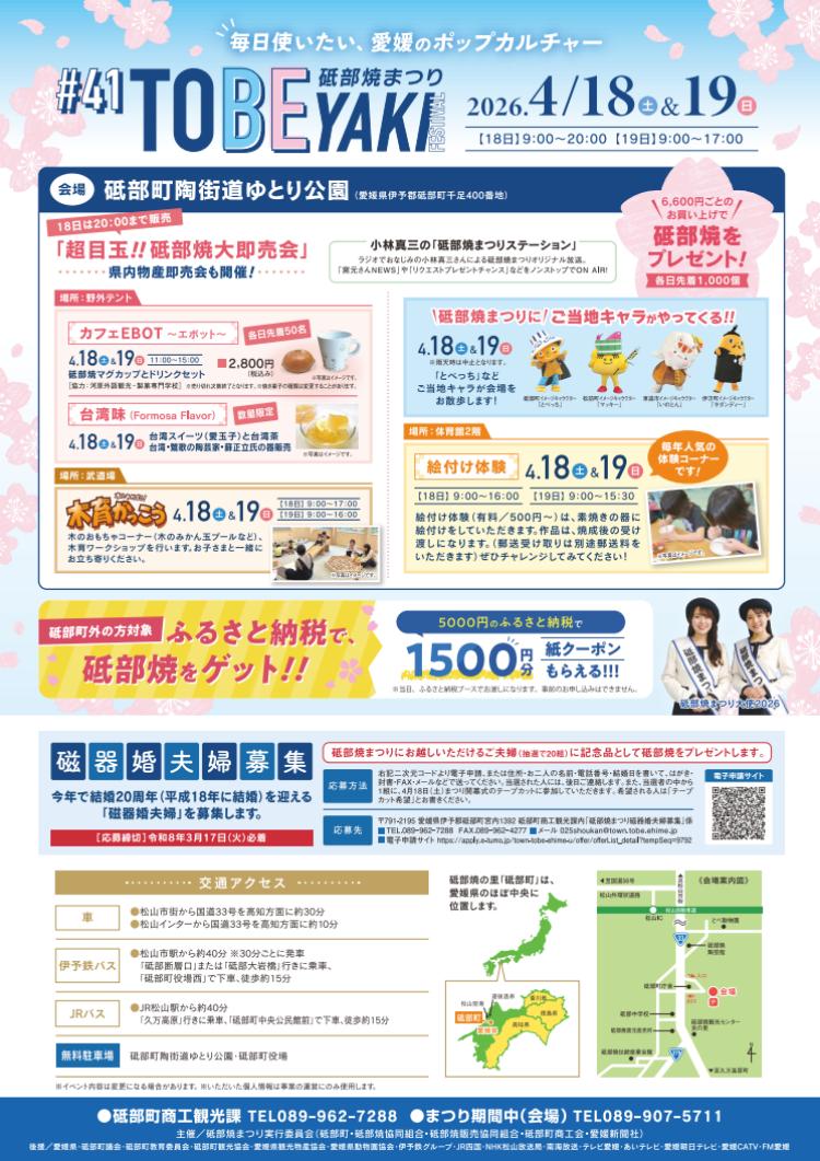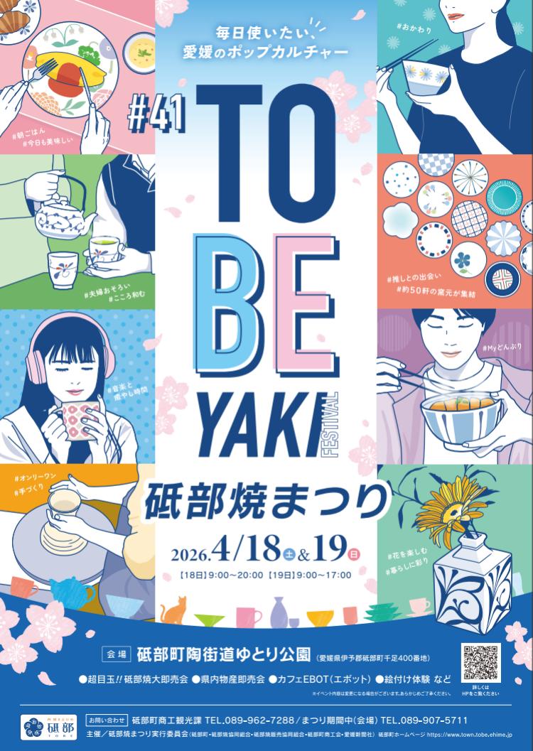 愛媛県伊予郡砥部町の「砥部町陶街道ゆとり公園」で、2026年4月18日(土)・19日(日)の2日間、「第41回 砥部焼まつり」が開催されます。