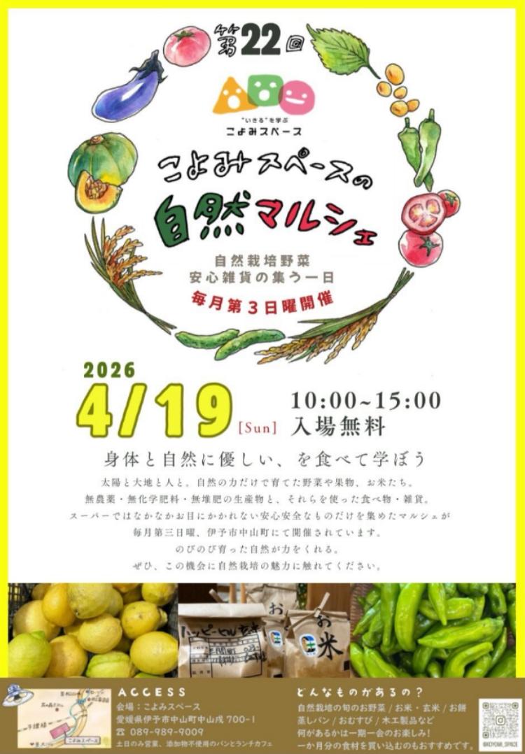 愛媛県伊予市中山町の「こよみスペース」で、2026年4月19日(日)に、「第22回 こよみスペースの自然マルシェ」が開催されます。