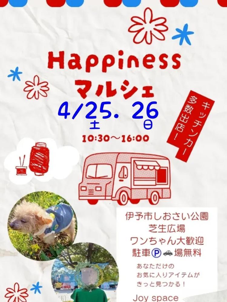 愛媛県伊予市の「しおさい公園・芝生広場」で、2026年4月25日(土)、26日(日)の2日間、「Happinessマルシェ」が開催されます。