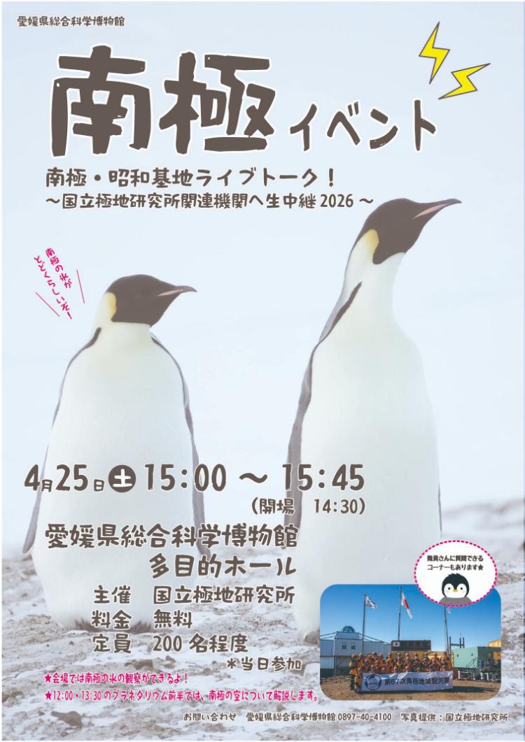 愛媛県新居浜市の「愛媛県総合科学博物館 多目的ホール」で、2026年4月25日(土)に、「南極イベント」が開催されます。