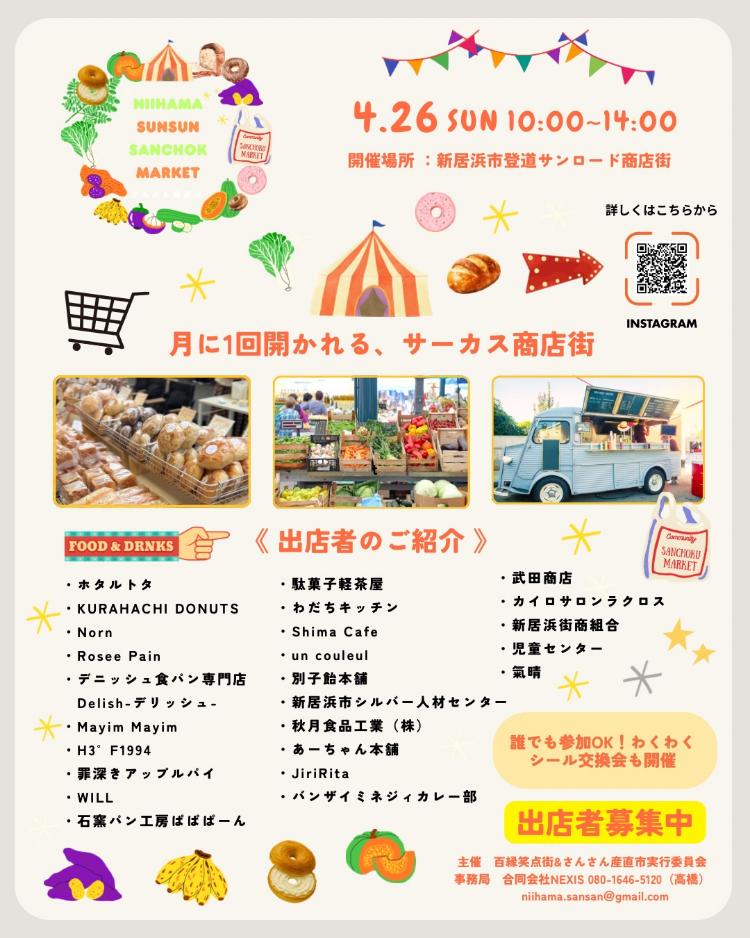 愛媛県新居浜市の「登道サンロード商店街」で、2026年4月26日(日)に、「NIIHAMA SUN SUN SANCHOK MARKET」が開催されます。