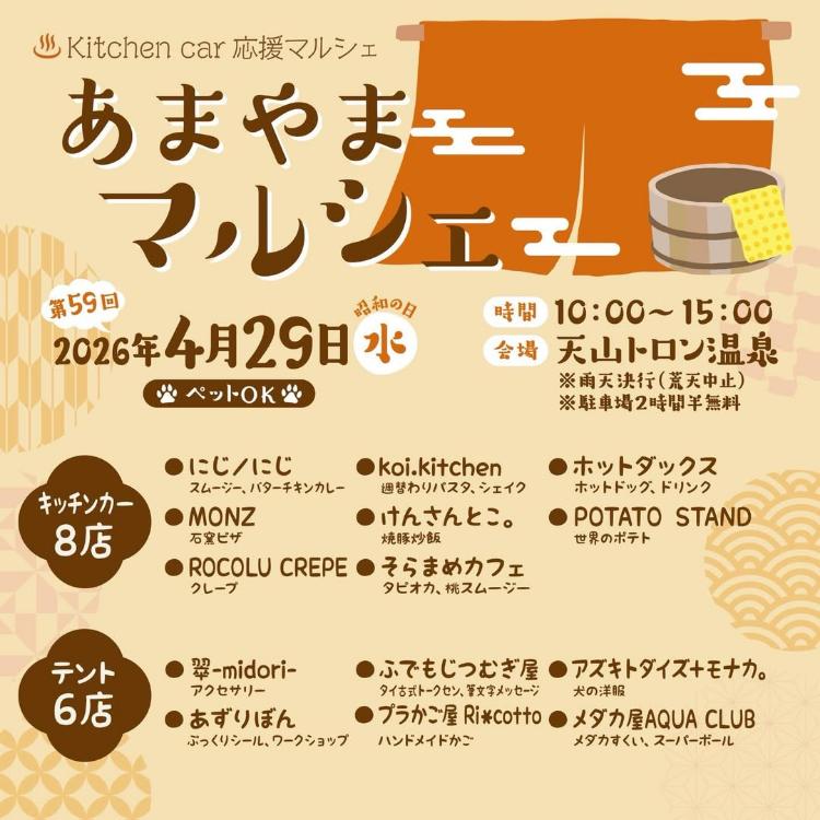 愛媛県松山市福音寺町の「天山トロン温泉」で、2026年4月29日(水・祝)に、「第59回あまやまマルシェ」が開催されます。