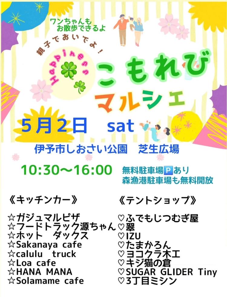 愛媛県伊予市の「しおさい公園・芝生広場」で、2026年5月2日(土)に、「こもれびマルシェ」が開催されます。