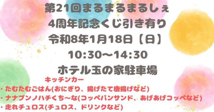 愛媛県西条市の「ホテル玉の家西条 駐車場」で、2026年1月18日(日)に「第21回 まるまるまるしぇ」が開催されます。キッチンカーなど多数出店!開催概要、出店情報、会場へのアクセス、駐車場の有無など気になる情報をまとめました。